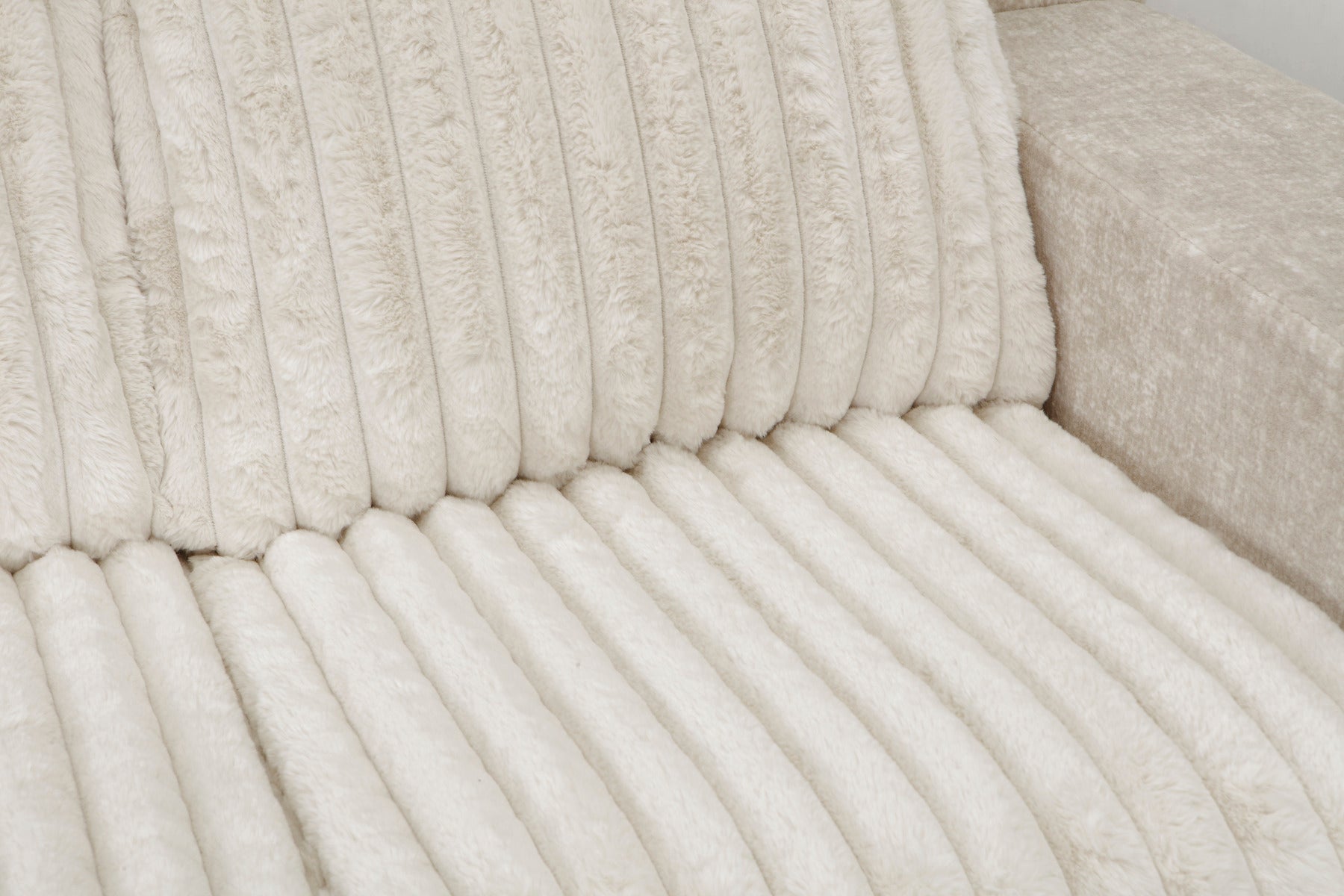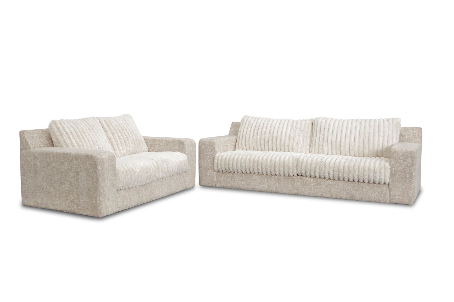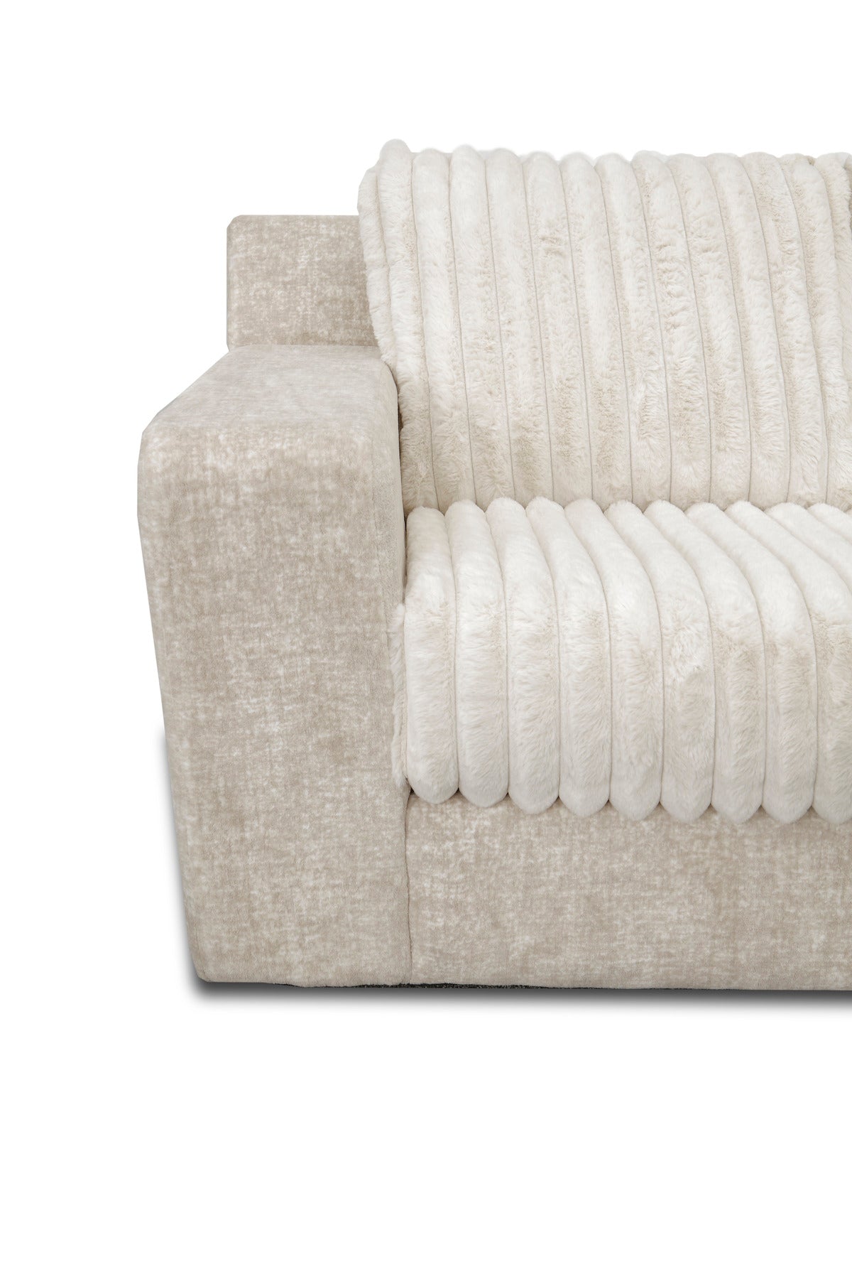 This sleek furniture collection is upholstered in the striking Mondo's fabric—a uniquely textured material that provides both a sophisticated look and a cozy feel. Its versatile color cream allows it to blend seamlessly into any décor, while its texture makes a quiet, modern statement.