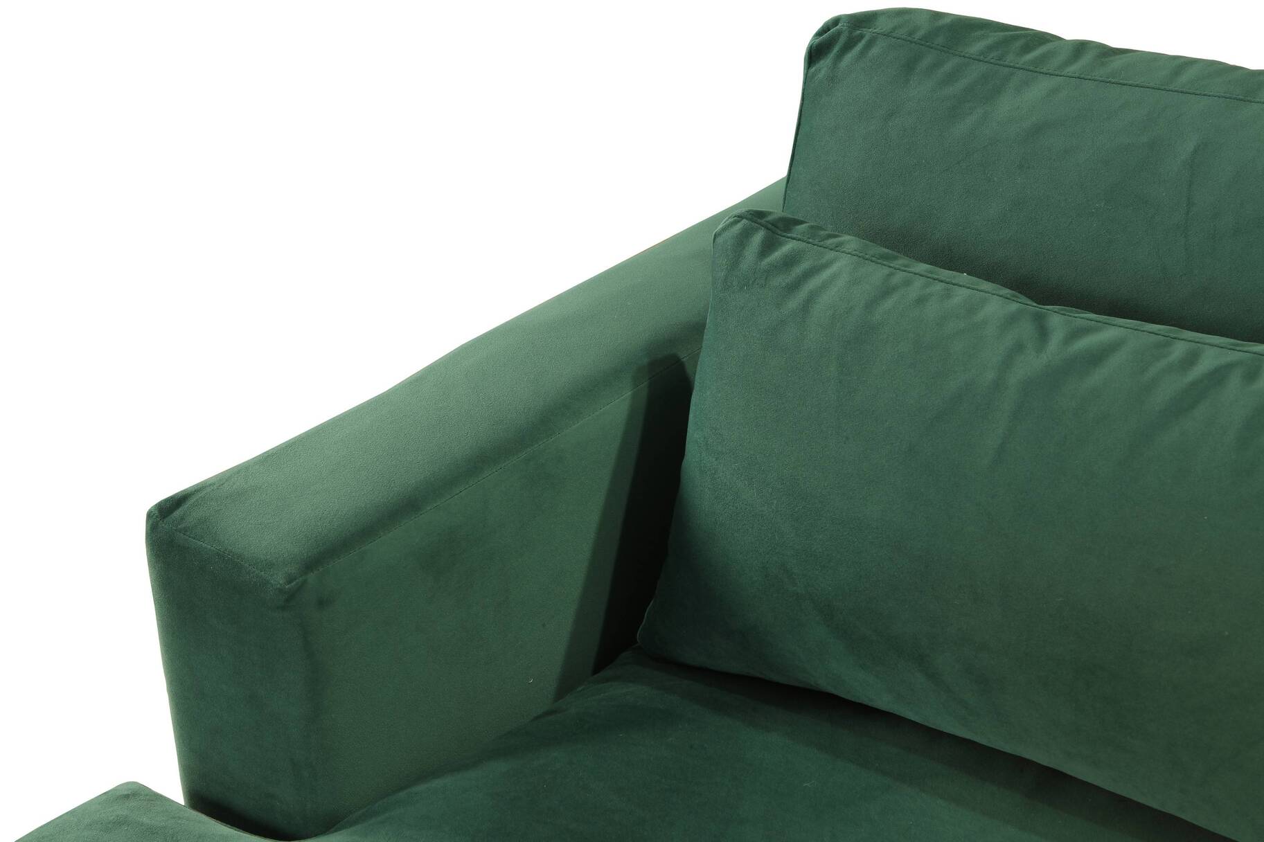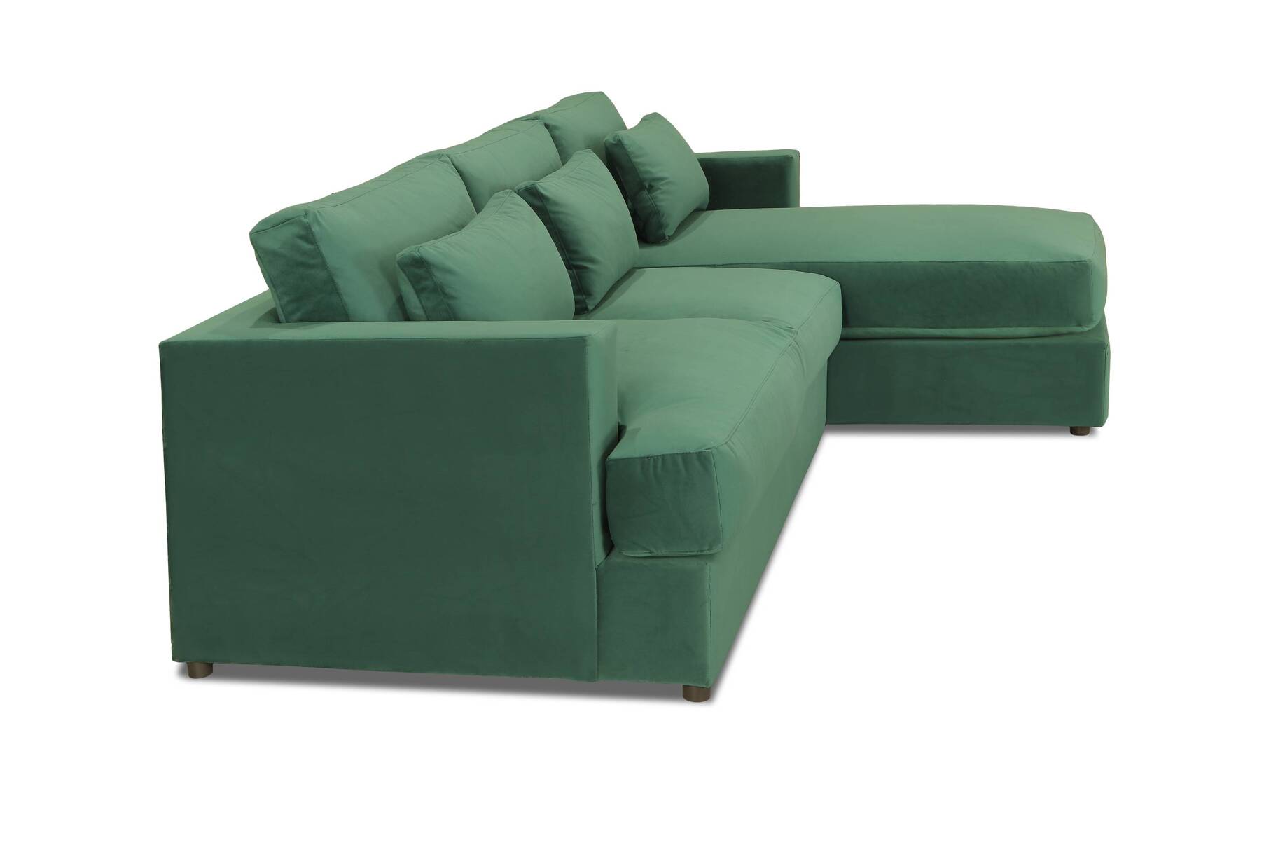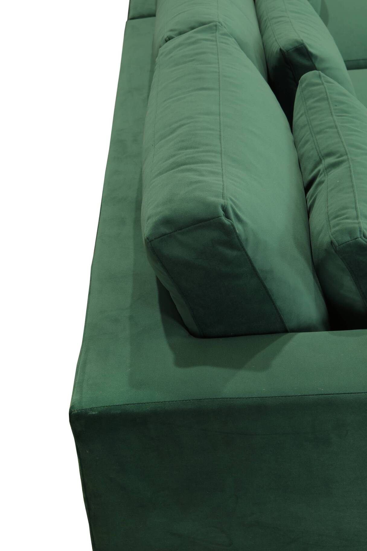 This deep-seated sofa with an extended chaise is upholstered in the striking Marquis Emerald fabric. This luxurious, jewel-toned fabric demands attention, creating an instant focal point that brings energy and high-end sophistication to any modern space.
