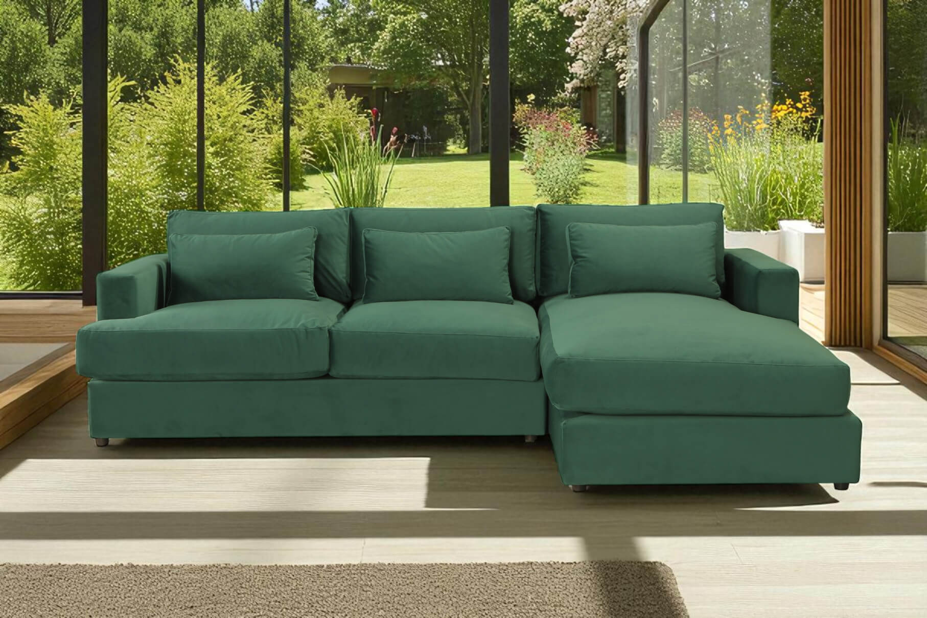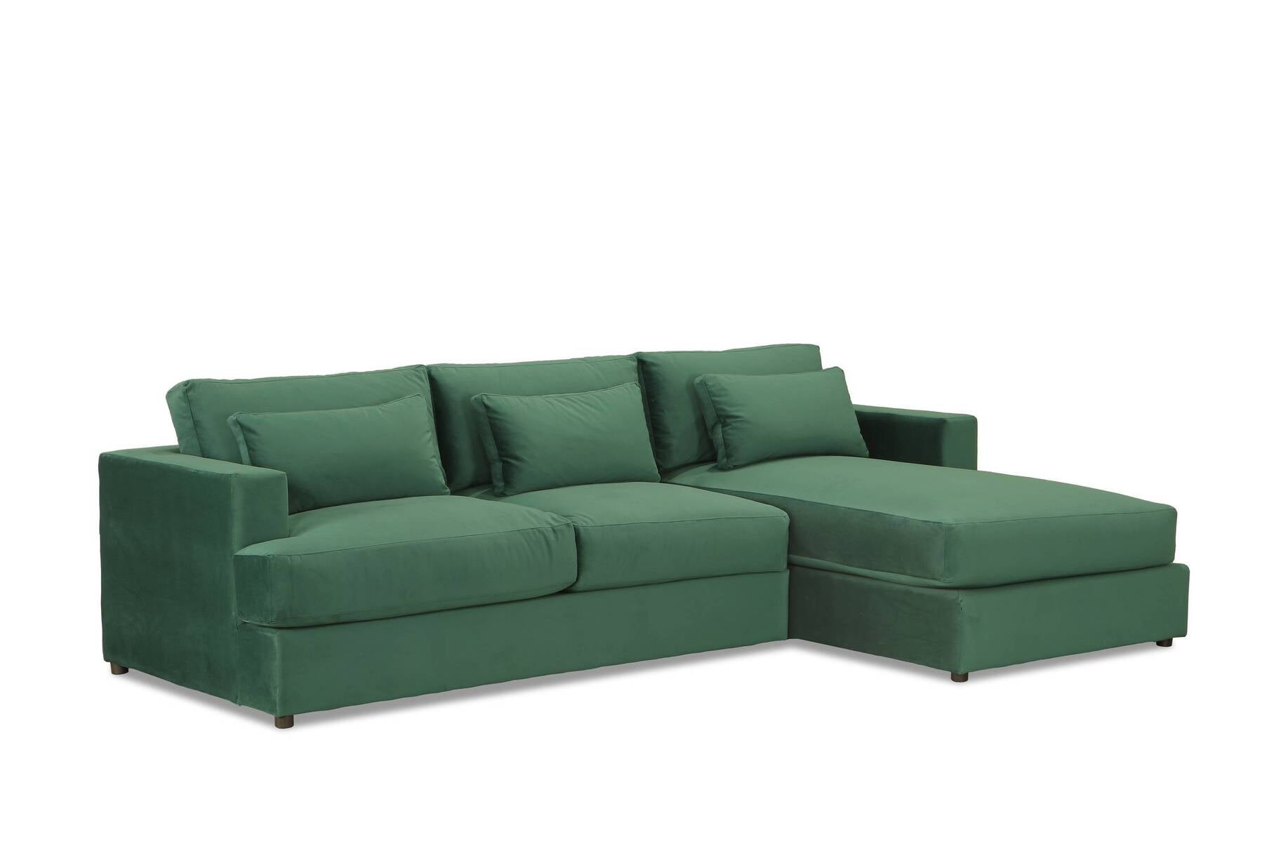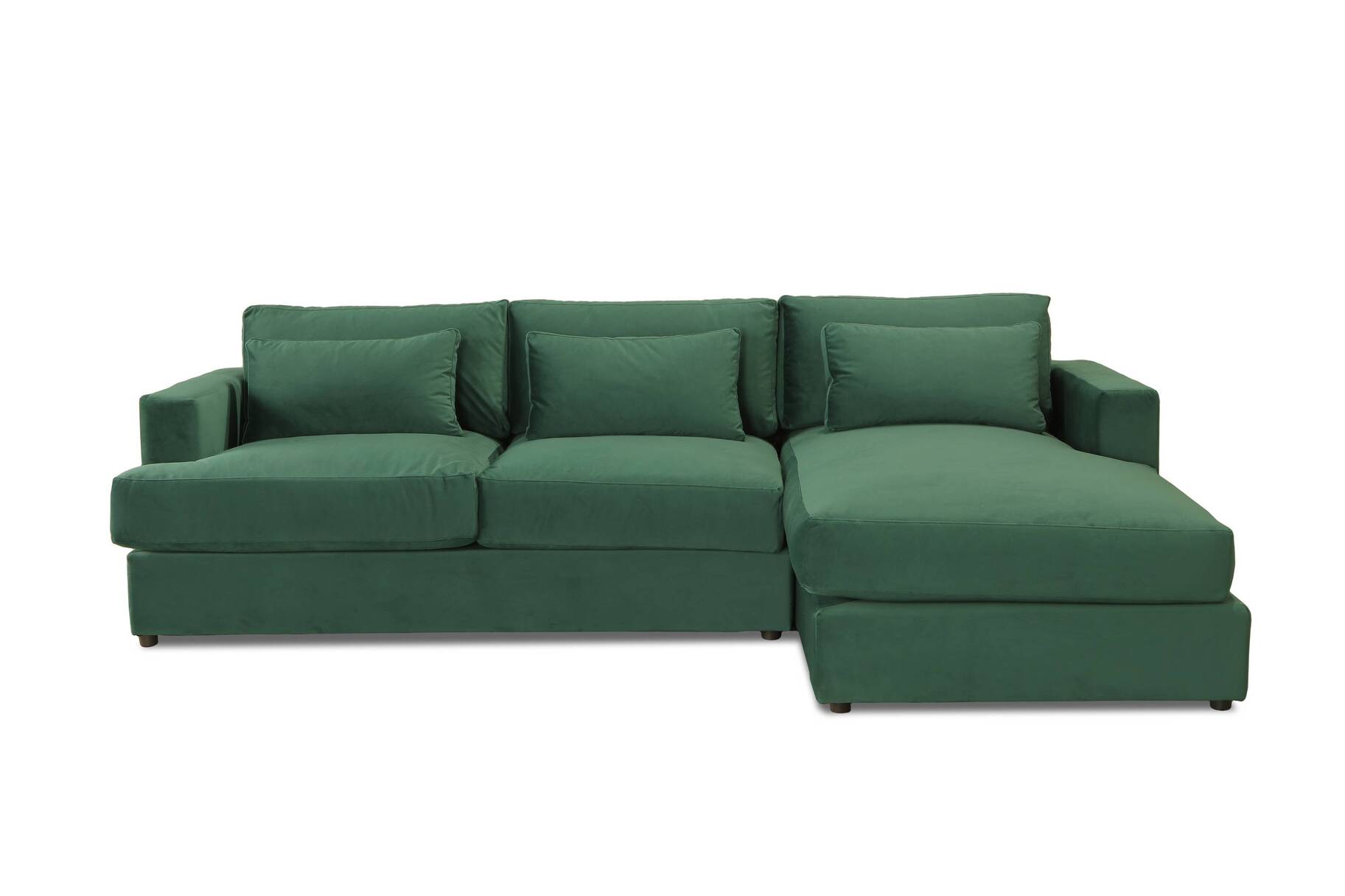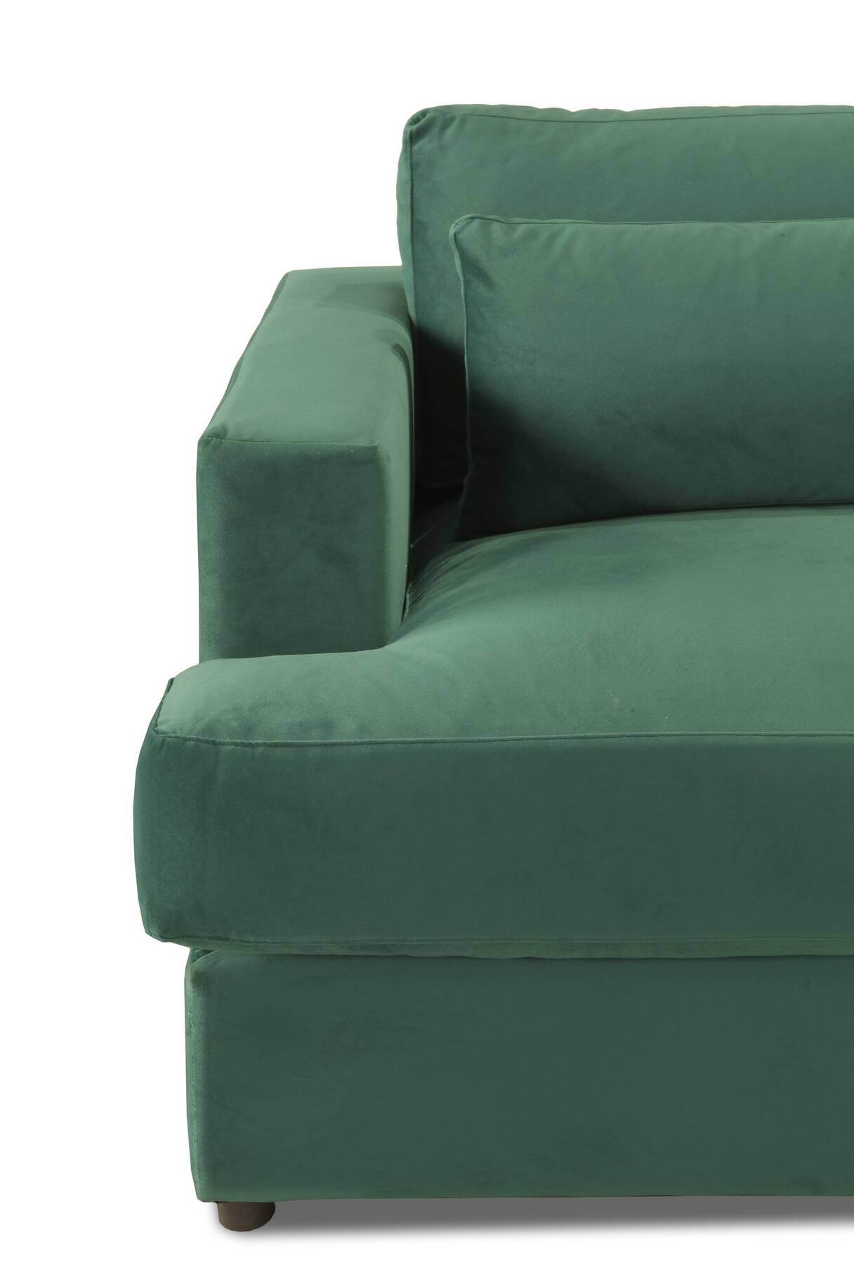 This deep-seated sofa with an extended chaise is upholstered in the striking Marquis Emerald fabric. This luxurious, jewel-toned fabric demands attention, creating an instant focal point that brings energy and high-end sophistication to any modern space.