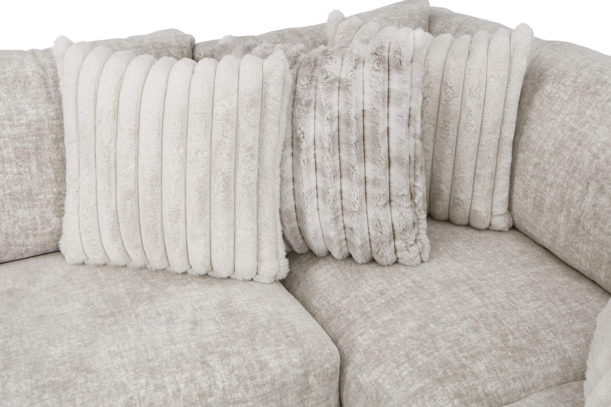 Crafted as the centerpiece for luxurious living, this expansive U-shaped sectional with its matching oversized ottoman is an instant invitation to relax. It is richly upholstered, a serene and elegant neutral fabric that brings warmth and brightness to any room.