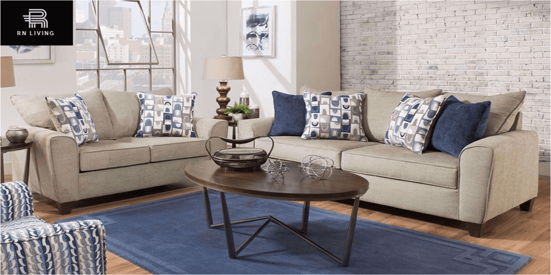 The Donavin collection features a clean, transitional design with subtle slope arms and deep, generous seating. The true style highlight is the accent pillow selection: the set includes rich, solid navy blue pillows and vibrant geometric-patterned pillows in shades of blue, beige, and white. This pairing injects a refreshing pop of color and modern visual interest.