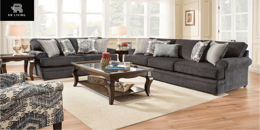The Bellamy set features a traditional silhouette, defined by beautifully rolled arms and plush, generous pillow-back seating for exceptional relaxation. The sophisticated look is enhanced by a curated selection of accent pillows, including soft striped patterns, solid gray textures, and striking geometric or medallion prints. These coordinated pillows add depth and visual interest.