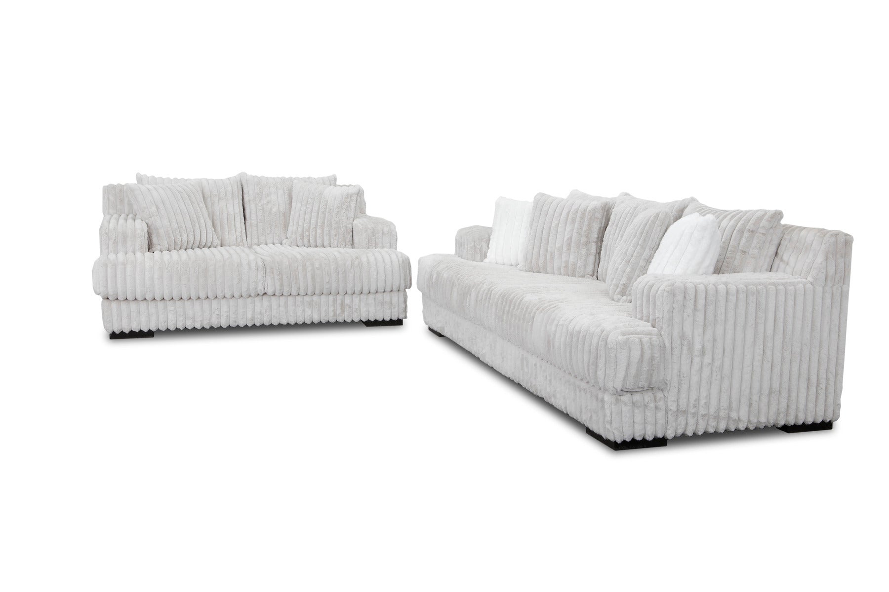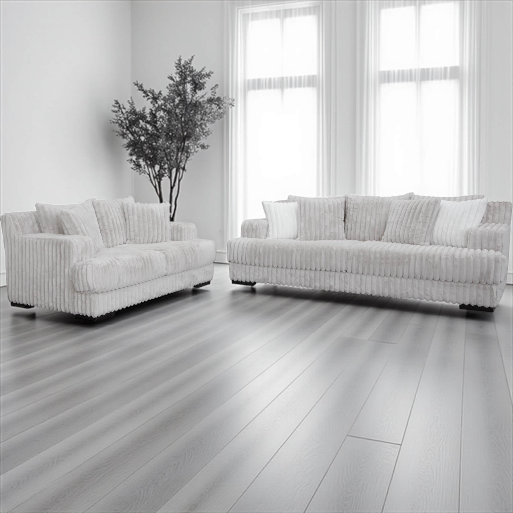 This contemporary seating arrangement is designed to be a soft, yet stunning focal point in your home. The pieces are lavishly upholstered in Mondo Grey fabric, featuring a unique, wide-wale corduroy or channel texture that adds incredible visual interest and a deeply cozy feel. The light grey tone is versatile, brightening your space while maintaining a sophisticated, modern neutral palette.
